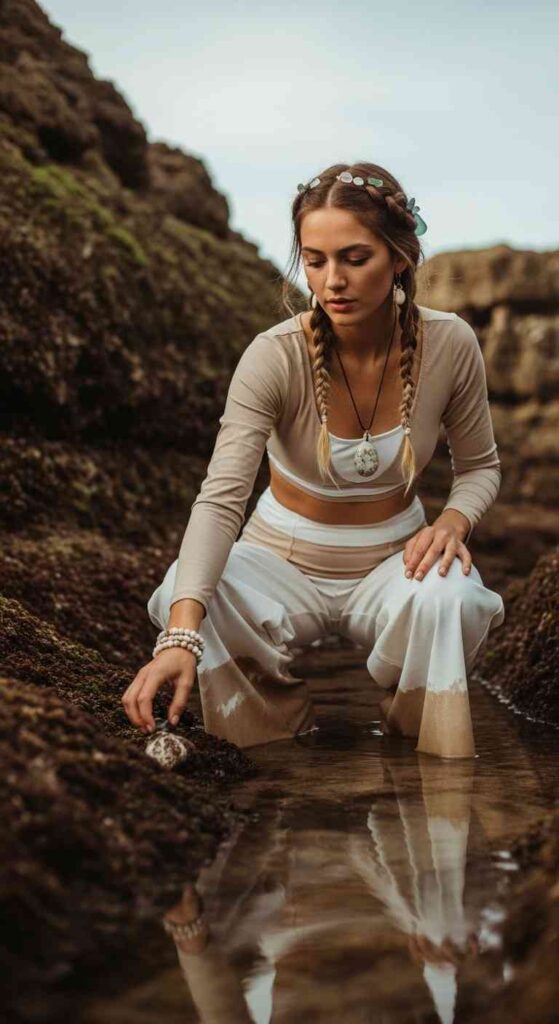 This deeply intriguing aesthetic imagines the woman as an explorer of ancient underwater ruins — sun-bleached, salt-washed, and full of quiet discovery. Sandy beige, weathered white, pale gold, and ocean-smoothed stone grey create a palette that looks like treasures pulled from the seafloor.