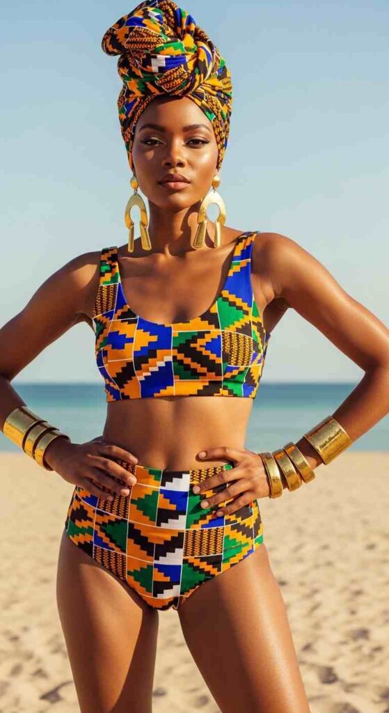 Afrofuturism — the celebration of African cultural heritage reimagined through a bold futuristic lens — produces some of the most visually stunning and culturally rich swimwear aesthetics possible. Kente-inspired geometric patterns in gold, forest green, royal blue, and black on a two-piece swimsuit is simultaneously deeply rooted in tradition and completely forward-looking.