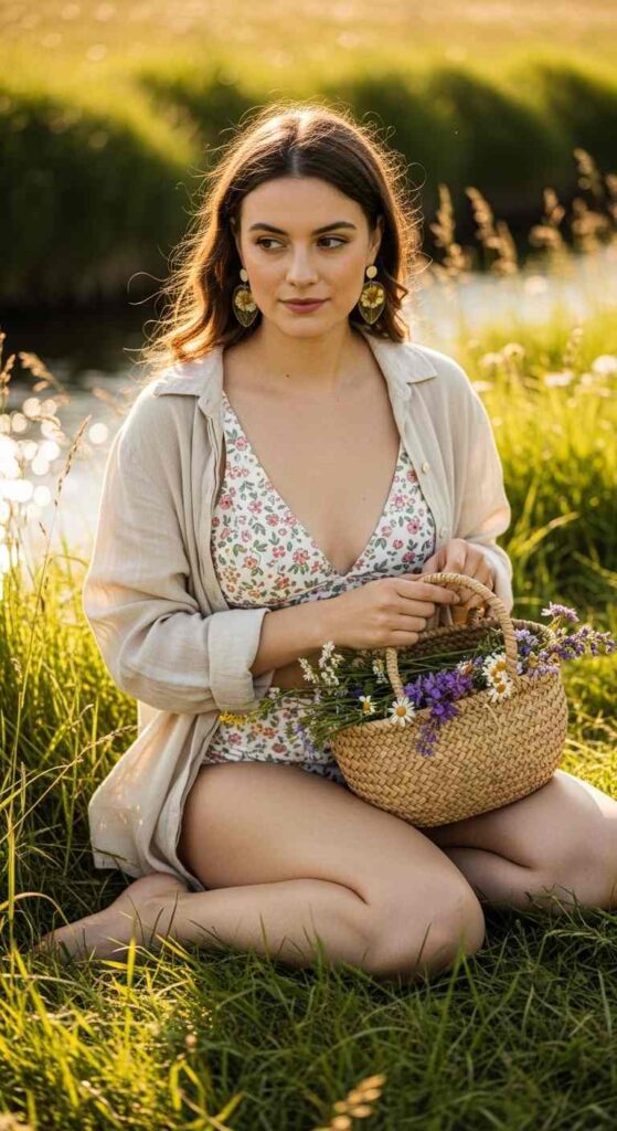 Styling Tip: A loose linen overshirt in the softest oatmeal shade worn open over the bikini, a hand-woven grass basket, and pressed flower accessories make this look genuinely enchanting.