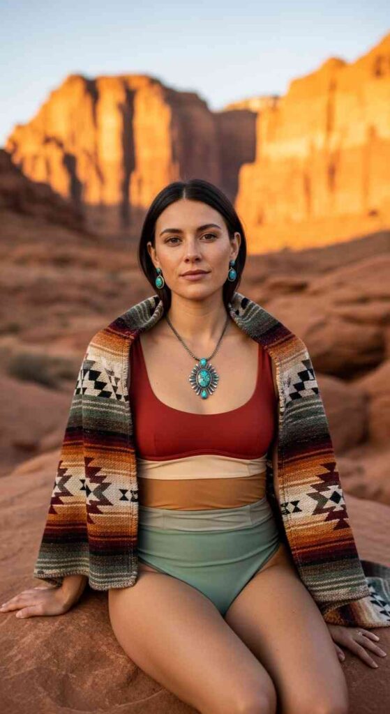 Styling Tip: Turquoise and silver Southwestern-style jewelry, a terracotta clay bead hair tie, and a handwoven Navajo-inspired blanket as a beach wrap complete this desert mirage aesthetic with stunning authenticity.