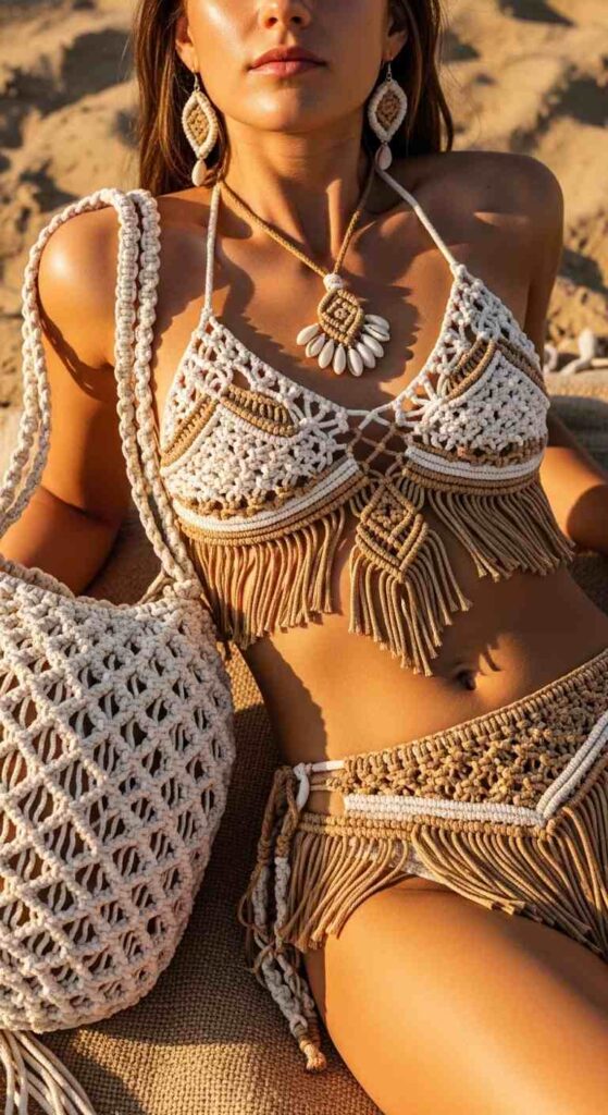 The handcraft macramé aesthetic celebrates slow fashion, artisanal skill, and natural materials in their most beautiful form. Intricate hand-knotted macramé detailing on a cream or natural sand-toned bikini looks like wearable sculpture — each knot tied by human hands, each piece completely unique.