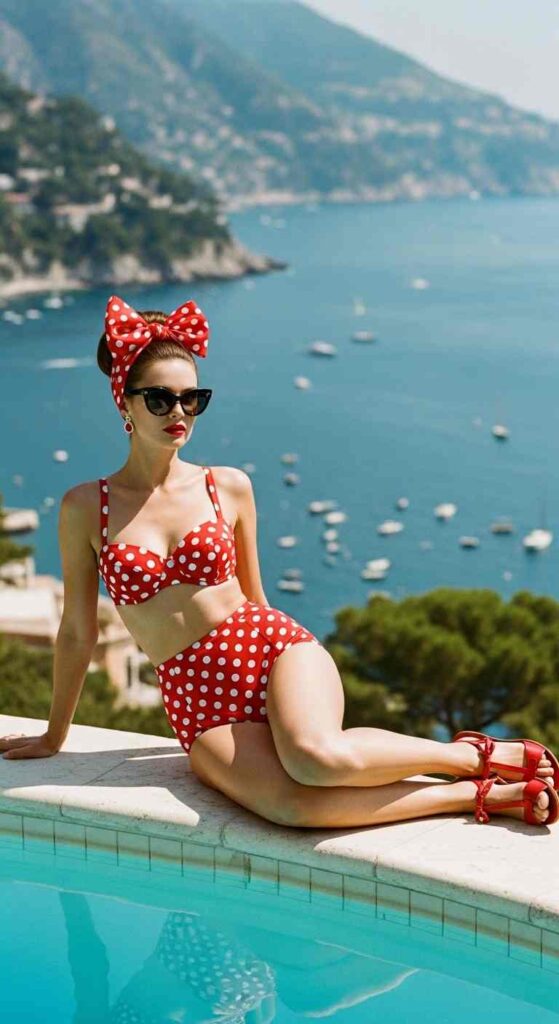 The French and Italian Riviera of the 1960s produced perhaps the most timelessly glamorous beach aesthetic in fashion history. Red and white polka dots on a classic structured two-piece captures that era of Brigitte Bardot and Sophia Loren — effortlessly glamorous, sun-drenched, and deeply cinematic.