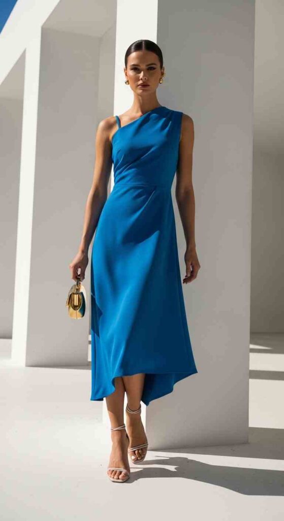 Asymmetric hemlines add a modern, fashion-forward edge to the classic dress silhouette. A bold solid color — think electric blue, cherry red, or sunny yellow — makes the look even more striking and confident.