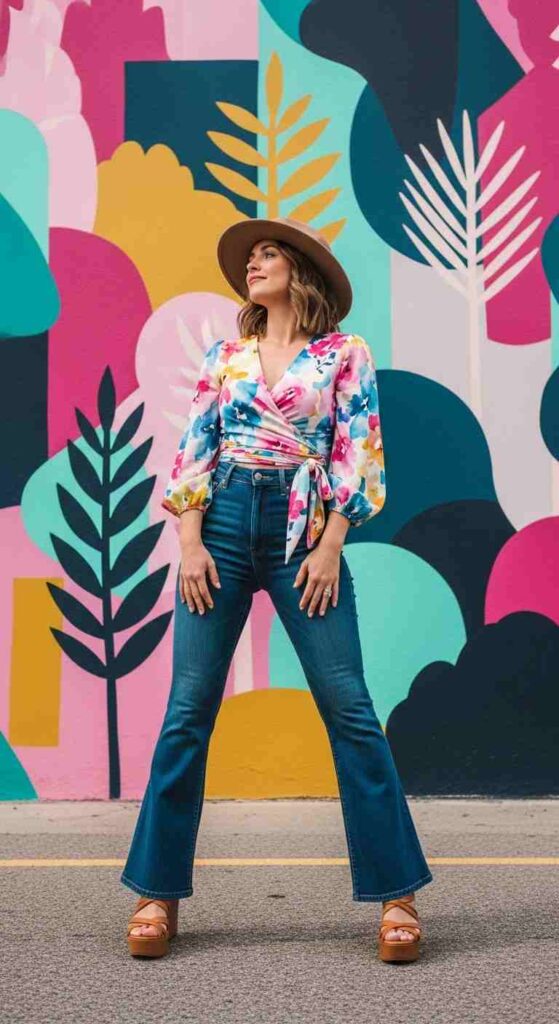 Wrap tops are universally flattering and incredibly easy to style. A printed wrap top — think watercolor florals, abstract brushstrokes, or vintage botanicals — paired with flared denim creates a retro-inspired look that feels fresh and modern.