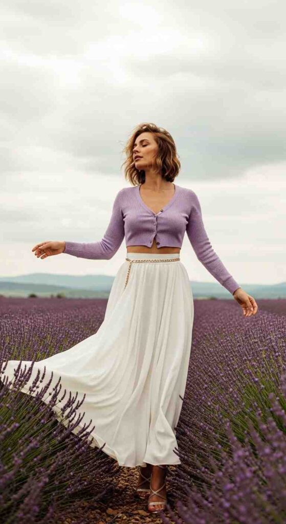 This pairing is pure spring magic. A soft cropped cardigan in a pastel — think baby blue, lilac, or blush — layered over a high-waisted flowing maxi skirt creates a dreamy, feminine silhouette.