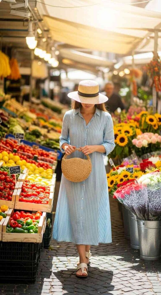 A linen shirt dress is practically a wardrobe miracle — breathable, stylish, and endlessly versatile. Wear it loose for a relaxed feel or cinch it with a thin leather or raffia belt to define your waist and add structure.