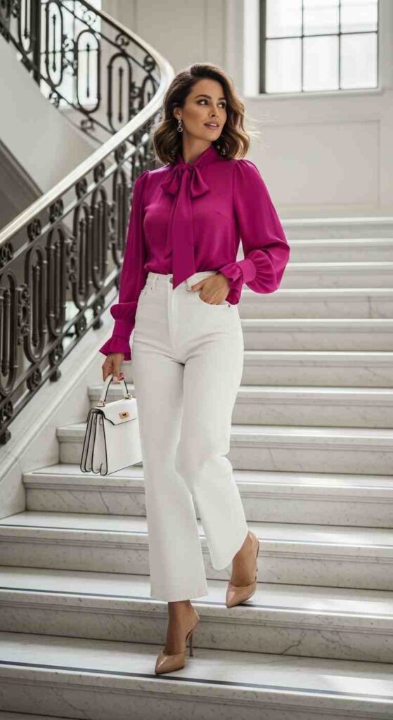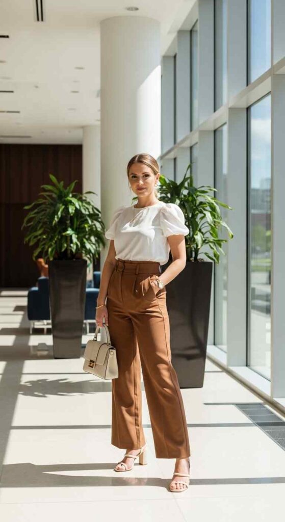 Puff sleeves add a romantic, playful touch to any outfit. A puff sleeve blouse in white, cream, or a soft pastel paired with structured wide-leg trousers in a complementary neutral shade creates a look that’s both fashion-forward and work-appropriate.