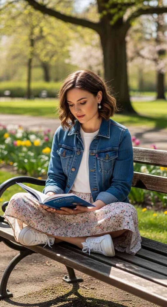 This three-piece combination is the quintessential spring transition outfit. A white tee provides the clean foundation, the floral midi skirt brings the seasonal spirit, and the denim jacket gives you the practical layering you need when morning temperatures are still cool.
