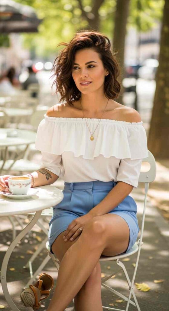 An off-shoulder blouse gives instant vacation energy without trying too hard. Paired with well-tailored high-waisted shorts in a neutral or pastel shade, this combo works for brunches, shopping trips, or a casual date afternoon.