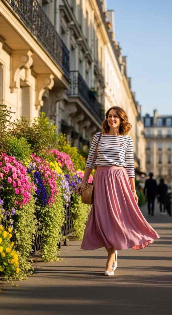 The classic Breton stripe tee is timeless, chic, and always in season. Pairing it with a lightweight flowy midi skirt in a solid color creates that perfect French girl aesthetic that looks polished without effort.