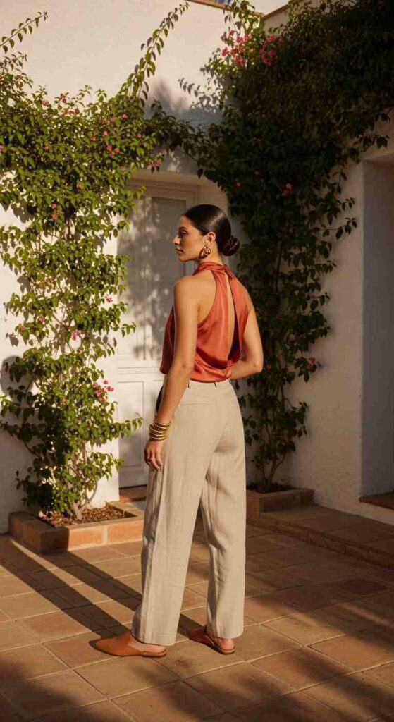 A halter neck top is a warm-weather essential that transitions beautifully from day to night. Pair it with relaxed linen trousers for a sophisticated yet completely comfortable summer look.