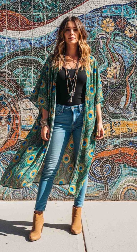 A printed kimono is the most effortless way to transform a basic outfit into something editorial and special. Throw a flowing kimono with a bold print over a simple tank and jeans combination and watch the whole look come alive.