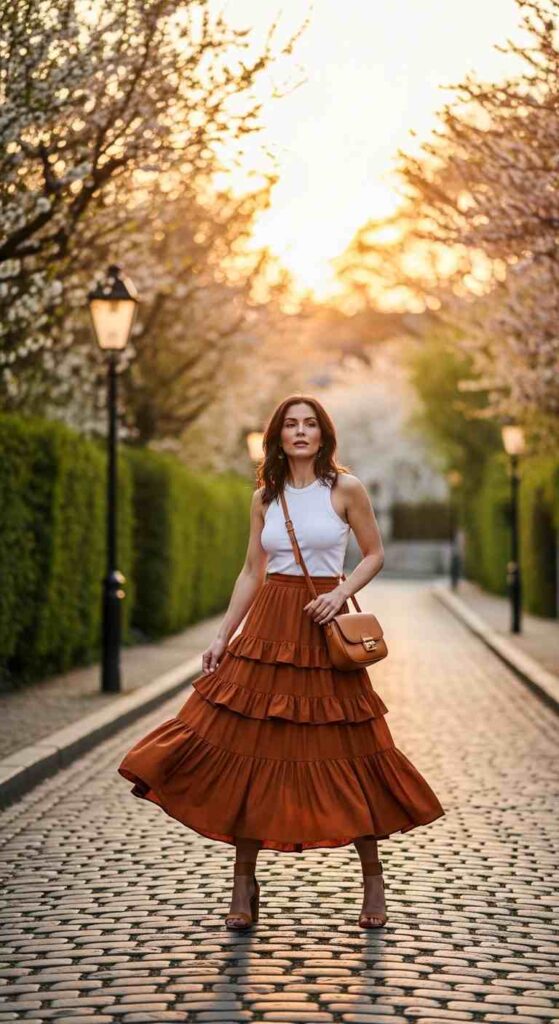When the weather starts warming up, a tiered ruffle skirt instantly adds femininity and movement to your look. Pair it with a simple fitted tank tucked in at the front for that effortless “I woke up like this” vibe. Choose earthy tones like terracotta, rust, or olive to keep it grounded and chic.