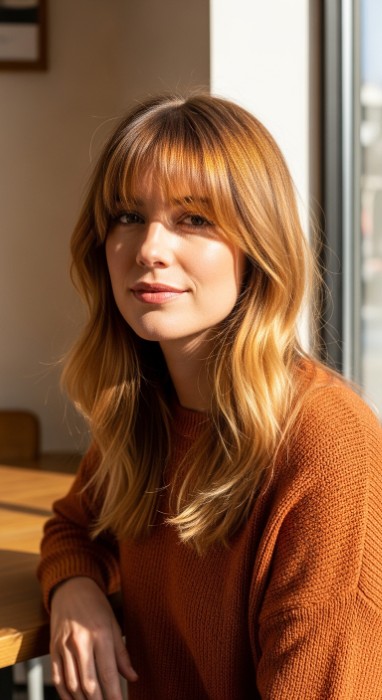 Why It’s Fashion-Forward: This style places concentrated honey amber tones exclusively within curtain bangs and front face-framing pieces, leaving the rest of the hair in a complementary neutral. It creates an instant facelift, brightens the complexion, and aligns with 2026’s emphasis on strategic, feature-enhancing color.