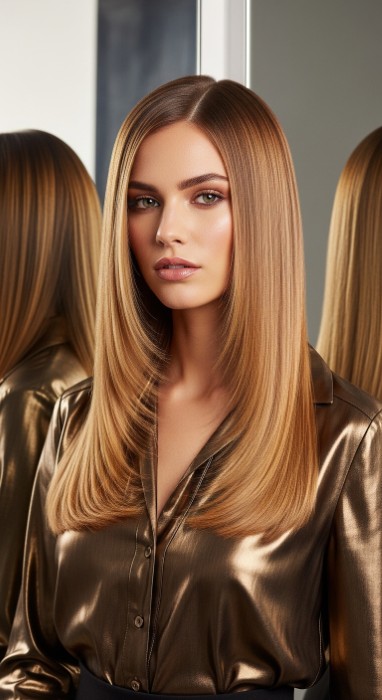 Why It’s Fashion-Forward: Building on the glass hair trend, this look features a deep-to-light honey ombré sealed with a high-gloss ceramic finish that creates liquid-like reflectivity. The honey tones are concentrated at the mid-lengths and ends, creating a radiant, mirror-smooth surface that looks impossibly sleek and luxurious.