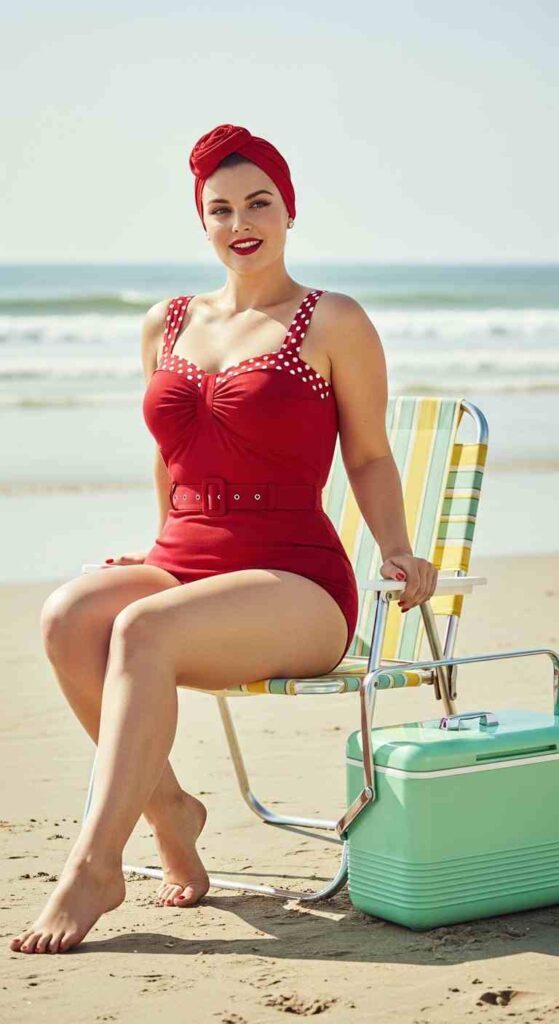 Take your beach style back to the golden era of Hollywood glamour with a belted one-piece swimsuit. A wide matching belt cinches the waist and creates that gorgeous 1950s hourglass silhouette. Choose a polka dot or solid retro color like cherry red or mint green.