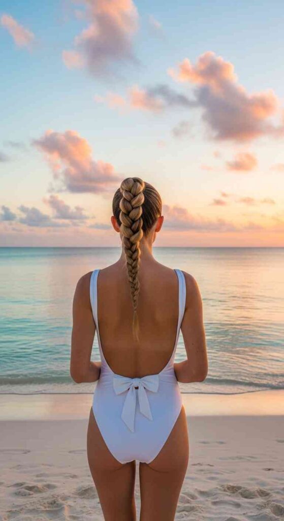 The front of this swimsuit is modest and classic — but the back tells a completely different story. A dramatic open back with a delicate bow or tie detail at the base of the spine is one of the most beautiful and surprising design choices in modern swimwear. It rewards the reveal.