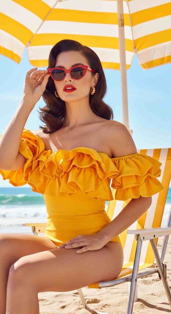 An off-shoulder one-piece with ruffle detailing is the most romantic and feminine silhouette you can wear at the beach. The ruffle frames the shoulders and collarbone beautifully, and a sunny yellow shade radiates warmth, happiness, and summer energy like nothing else.