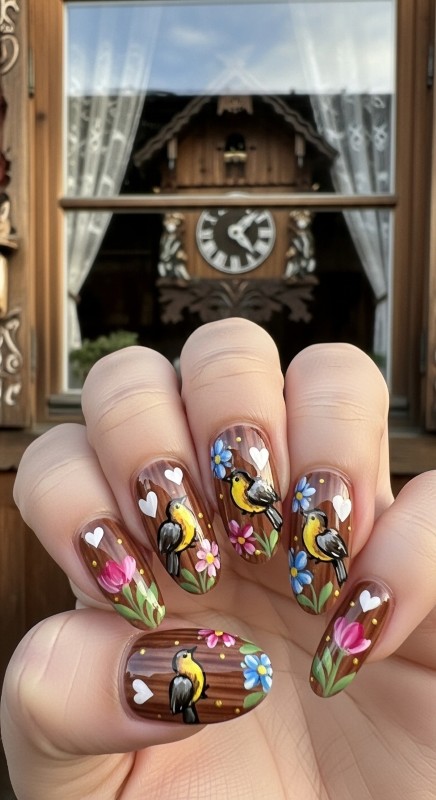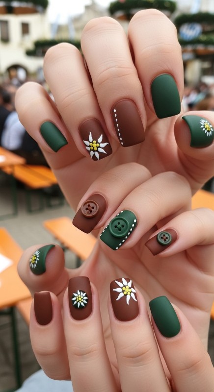 Why We Love It: Traditional Bavarian lederhosen get a feminine nail art makeover! The rich brown mimics leather, while green accents and edelweiss flowers reference traditional Alpine style. It’s cultural, unique, and surprisingly chic.