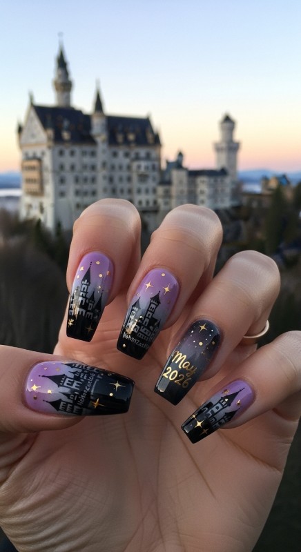 Why We Love It: Germany’s fairytale castles like Neuschwanstein are iconic. This dreamy design features castle silhouettes against a twilight sky, creating a magical, storybook aesthetic. The gold accents add luxury. It’s perfect for dreamers and history enthusiasts.