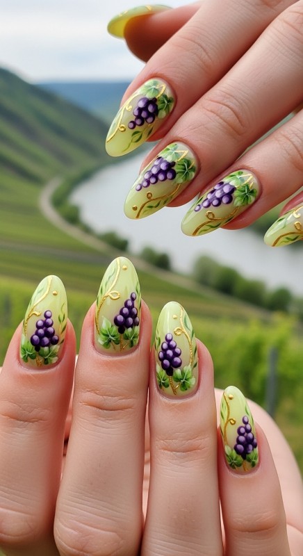 The Design: Pale yellow-green base with clusters of purple and green grapes, gold vine details.