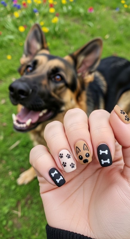 The Design: Tan and black color scheme with tiny paw print accents and bone-shaped details on neutral base.