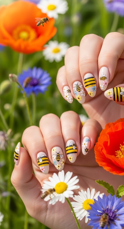 The Design: Yellow and black striped accents with tiny hand-painted bees on a soft cream or white base with floral elements.