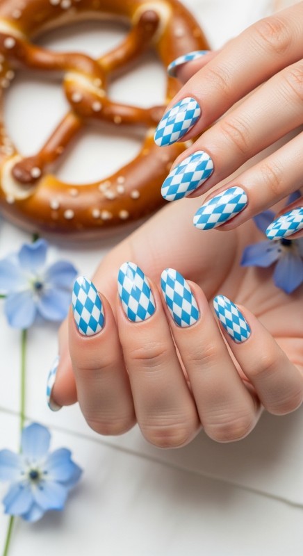 The Design: Classic Bavarian flag-inspired blue and white diamond patterns on a neutral base, reminiscent of Oktoberfest tents but softened for spring.
