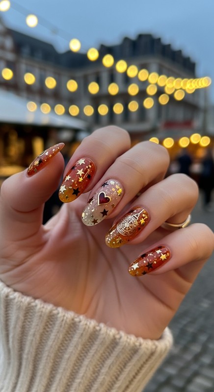 The Design: Warm amber and gold tones with tiny star, heart, and ornament shapes—spring version of Christmas market magic.