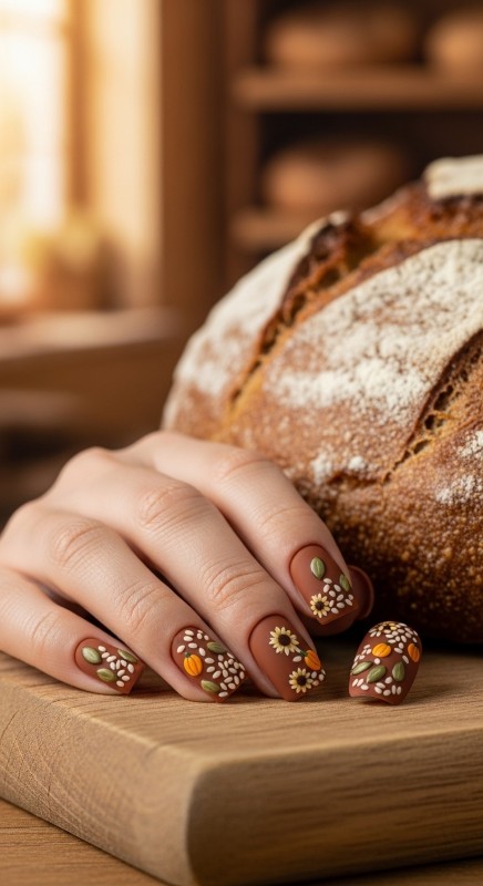 The Design: Warm brown base with tiny painted seeds (sunflower, pumpkin, sesame) in natural tones, matte finish.