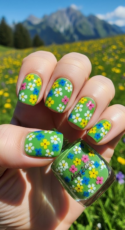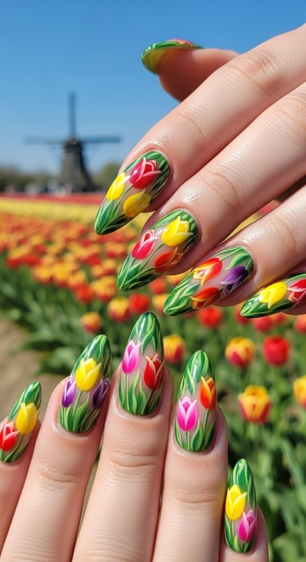 Why We Love It: May is peak tulip season in Germany, and these colorful gardens deserve celebration. Each nail can feature different colored tulips, creating a rainbow effect. The green base represents fresh spring grass. It’s cheerful, vibrant, and perfectly seasonal for May 2026.