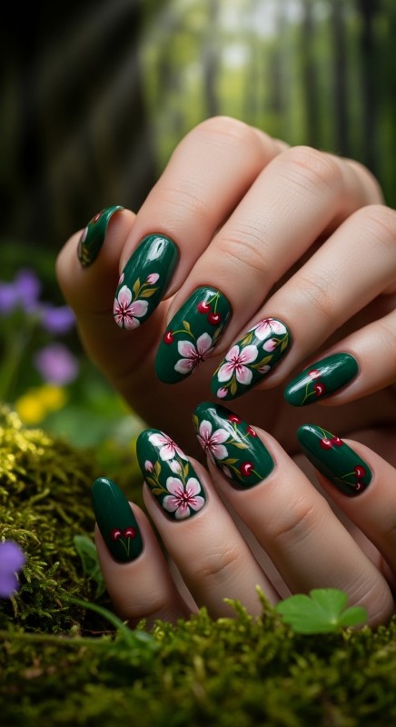 The Design: Deep forest green base with delicate pink cherry blossom accents and tiny red cherry details.