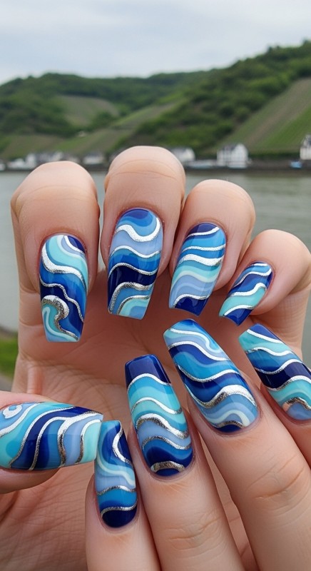 Why We Love It: Germany’s Rhine River is iconic, and these flowing wave patterns capture its movement beautifully. The layered blues create depth, while silver accents add dimension and catch the light. It’s fluid, feminine, and deeply connected to German geography and culture.