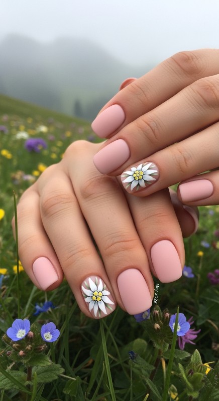The Design: Nude or soft pink base with delicate white edelweiss flowers painted on accent nails, finished with matte top coat.