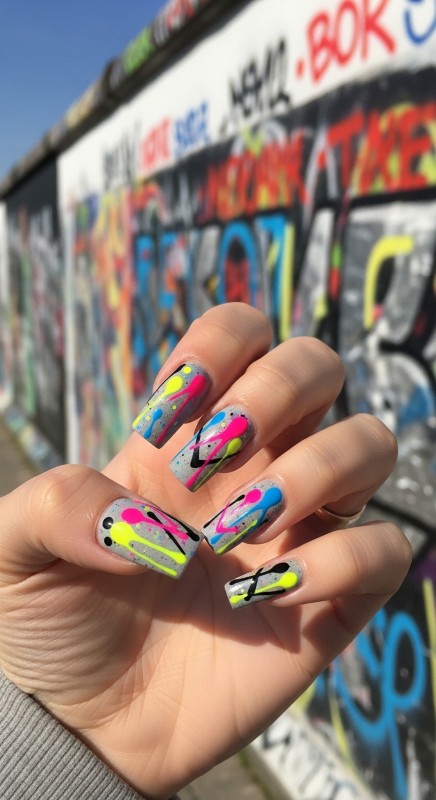 The Design: Bold, colorful abstract graffiti-inspired designs with neon accents on a white or concrete grey base.