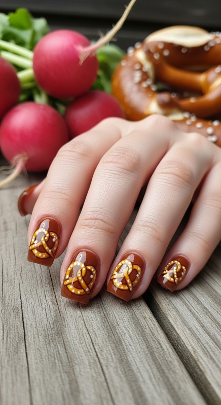 Why We Love It: German pretzels (Brezeln) are iconic, and this playful design celebrates them in nail art form. The twisted shapes add visual interest, while the warm brown palette is perfect for late spring. It’s whimsical without being childish—great for foodies and culture lovers.