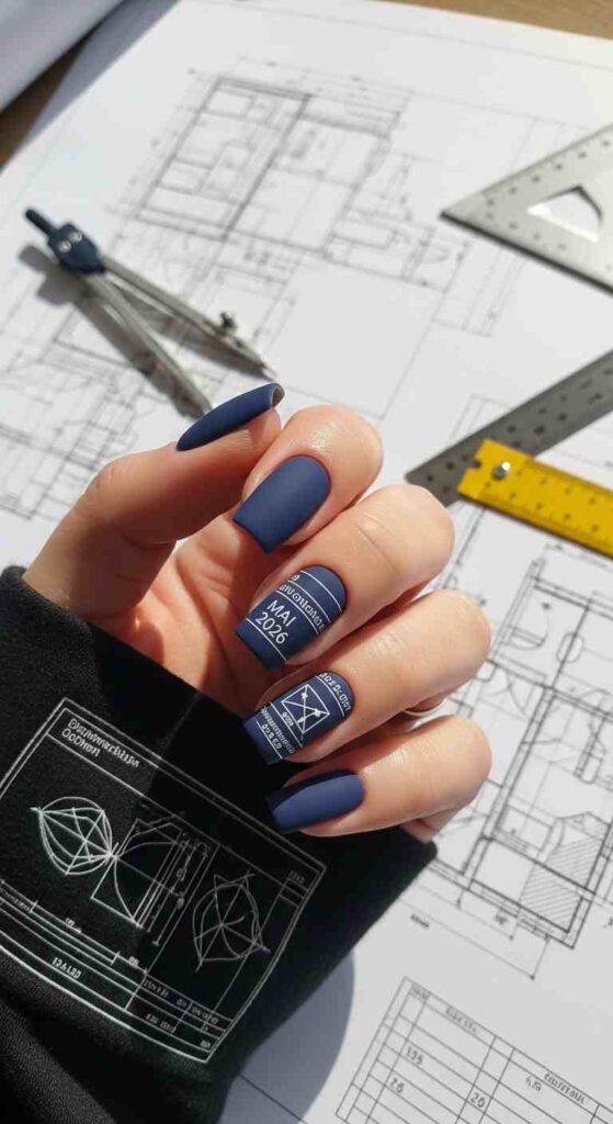 The Design: Navy blue base with white technical drawing lines, geometric precision patterns, and measurement marks.