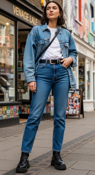 Why It’s Cool: The Canadian tuxedo gets a London upgrade with perfectly fitted denim pieces in complementary washes, a statement belt to define the waist, and chunky boots for edge. This look is casual yet cool, comfortable yet stylish—perfect for long days of exploration.