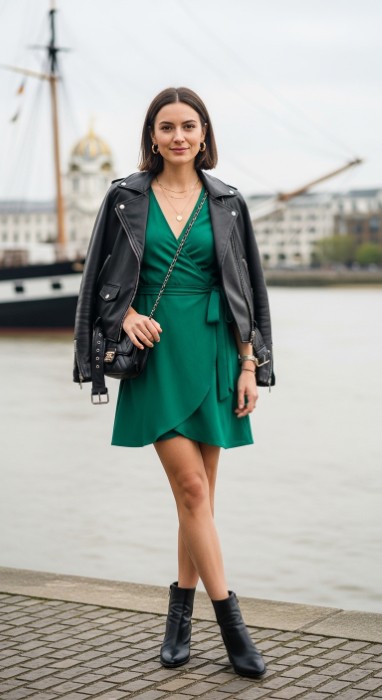 11. Wrap Dress with Leather Jacket and Ankle Boots