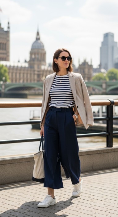 Why It’s Cool: Wide-leg culottes are comfortable and chic, perfect for warm travel days. Paired with a classic Breton striped tee and an unstructured blazer, this look is effortlessly French-meets-London cool. It’s polished enough for nice restaurants yet comfortable for long days of walking.