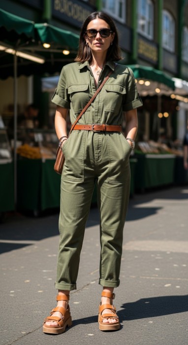 Why It’s Cool: A jumpsuit is the ultimate travel piece—one piece, endless style. This utility-inspired jumpsuit in a neutral tone is belted at the waist for definition and paired with chunky sandals for that perfect London summer vibe. It’s practical, comfortable, and undeniably cool.