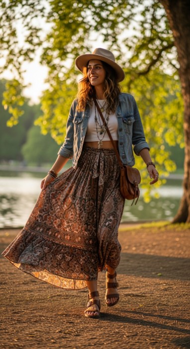 Why It’s Cool: This bohemian-meets-urban combination features a flowing maxi skirt paired with a crop top and denim jacket for that perfect London festival vibe. It’s free-spirited yet grounded, comfortable yet stylish—ideal for summer concerts or casual exploring.