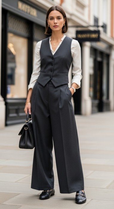 15. Tailored Vest with Wide-Leg Pants and Loafers