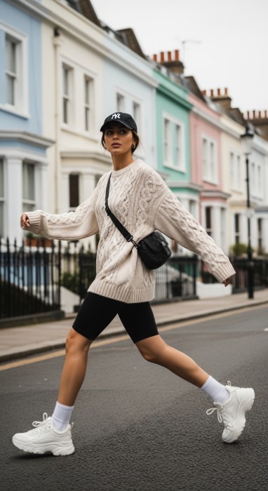 Why It’s Cool: This athleisure-meets-street-style combination is pure London cool. An oversized sweater provides comfort and coverage while bike shorts keep things modern and trainers ensure all-day comfort. It’s the kind of look you see on Londoners running errands or grabbing coffee.