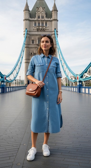 Why It’s Cool: A midi shirt dress is the ultimate travel dress—versatile, comfortable, and effortlessly chic. Paired with white sneakers and a crossbody bag, it’s perfect for long days of exploring while maintaining style. Add a belt for definition or wear loose for maximum comfort.
