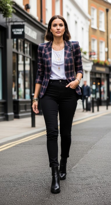 Why It’s Cool: A plaid blazer adds instant London credibility to any outfit. Paired with a simple white tee and black jeans, this look is effortlessly cool and perfectly balanced between smart and casual. It’s the kind of outfit that works for almost any occasion.