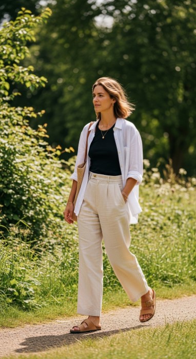 Why It’s Cool: This layered look features breathable linen trousers perfect for warm weather, a simple tank, and an oversized shirt worn open as a light layer. It’s practical for temperature changes while maintaining that effortless London cool. The linen keeps you comfortable while the layers add interest.