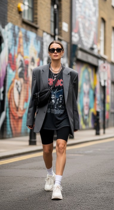 Why It’s Cool: This quintessential London look balances tailored sophistication with streetwise edge. An oversized blazer in a neutral tone instantly elevates a vintage band tee and cycling shorts, creating that perfect high-low mix Londoners do so well. The blazer adds structure and polish while the casual underneath keeps you cool and comfortable for long days of exploring.