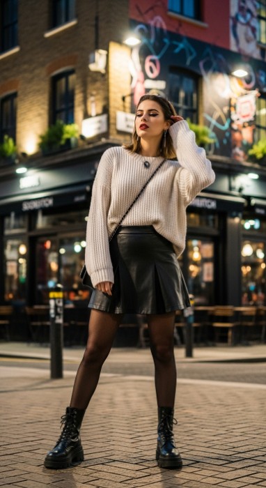 Why It’s Cool: A leather mini skirt adds edge to any outfit, and paired with a cozy sweater and chunky boots, it’s perfect for London’s unpredictable weather. This look balances tough and soft, making it effortlessly cool and perfectly London.