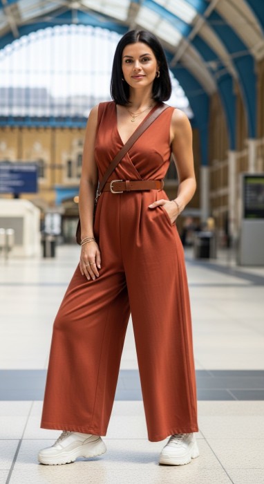 Why It’s Cool: This contemporary jumpsuit features wide legs for comfort and movement, belted at the waist for definition. Paired with chunky trainers, it’s the ultimate travel outfit—comfortable, stylish, and effortlessly cool. It’s one piece that does it all.
